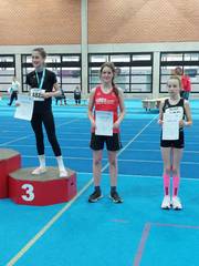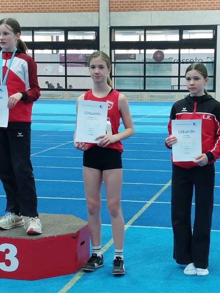 Ihr Wettkampfdebüt gab Louisa Knigge (W13). Entsprechend groß war ihre Nervosität zu Beginn. Im Hürdensprint erreichte sie in 11,52 Sek. als 17. eine Platzierung im Mittelfeld, zeigte dabei aber, dass noch viel Luft nach oben ist. Im 60-m-Sprint erreichte sie von über 60 Starterinnen als 24. einen der drei Finalläufe, in welchem sie sich in 8,81 Sek. auf den 17. Platz vorkämpfte. Richtig gut lief es im Weitsprung, als sie im zweiten Durchgang bei 4,46 m landete und mit dieser Weite auf den fünften Platz kam. Zum Abschluss zeigte sie noch eine tolle Vorstellung über 800 m, als sie in 2:46 Min. Vierte wurde.