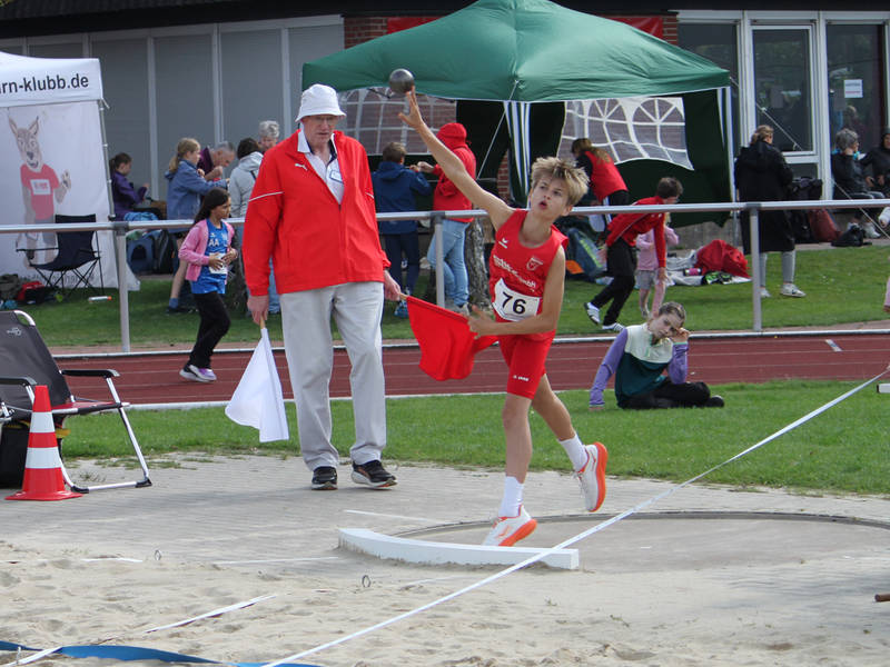 Mitte Juni ging es wieder nach Altwarmbüchen. Yakoub lieferte im Dreikampf solide Leistungen ab (8,10 Sek., 3,72 m, 29 m), die ihm den sicheren Sieg einbrachten. Auf einen Sieg hoffte auch Jonathan Hartmann (M11), nachdem er über 50 m endlich die Acht-Sekunden-Grenze geknackt hatte (7,97 Sek.). Mit seinem Ballwurf (37,50 m) steuerte er weitere wichtige Punkte bei. Dafür haderte er mit dem Weitsprung und blieb mit 3,91 m unter Wert. Den Dreikampf beendete er als Zweiter – gerade mal sechs Punkte hinter dem Sieger. Achter wurde hier Matteo Läpke (u.a. 8,23 Sek.).