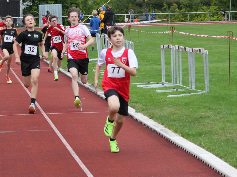 Die Goldmedaille holte – fast schon erwartungsgemäß, da er die beste gemeldete Zeit hatte – Jakob Knublauch (M13) über 800 m, der sich nach dem Startschuss durch einen großen Pulk direkt nach vorne kämpfte und bis zum Ziel die Führung innehatte. In 2:31 Minuten ließ er die Konkurrenz mehrere Sekunden hinter sich.