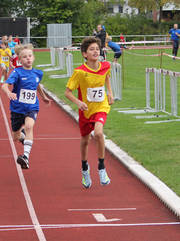 Bevor 800-m-Läufer Jakob Knublauch (M13) in seiner Lieblingsdisziplin an den Start ging, trat er im Hürdensprint an und wurde in guten 11,55 Sek. Zweiter. Den anschließenden 800-m-Lauf ging er etwas zu schnell an und hatte am Ende nichts mehr zuzusetzen. Mit 2:30 Minuten wurde er zwar ungefährdet Erster seiner Altersklasse, war aber mit der Zeit nicht ganz zufrieden.