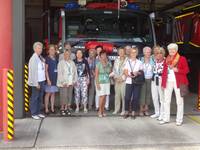 Im Anschluss besuchten die Teilnehmer die Flughafen Feuerwehr. Sehr eindrucksvoll waren allein schon die Fahrzeuge, die Bereifung und die sehr durchdachte Bestückung eines Zuges. Einen lustigen Anblick boten die einsatzbereiten Feuerwehrstiefel und die dazugehörige Hose. Die Brandbekämpfungsfahrzeuge sind mit einer Wärmebildkamera und Wasserwerfer für 90 m Entfernung mit 6000 l Wasser und Schaum ausgestattet. Ein Fahrzeug hat 1400 PS, wiegt 53 t und verbraucht einen Liter Sprit pro km.
