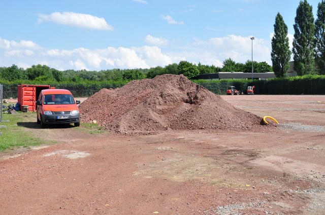 Am 3.September 2012 ist mit den Vorbereitungen begonnen worden, die Planumschicht zu erstellen. Hierfür wurde zunächst durch das Transsportunternehemn Winter aus Hemmingen das benötigte Bodenmaterial angeliefert. Mit Baggern und einem sogenannten Grader wird jetzt das Material auf der gesamten neuen Spielfläche verteilt. Das tragfähige und nivelliertes Planum als Unterbau wurde am 11.09.2012 fertiggestellt. Zur Qualitätssicherung hat der Verein diverse Druckversuche in Auftrag gegeben, um sicherzustellen, dass alle weiteren Baumaßnahmen auf einem optimal tragfähigen Grund aufgebaut werden.