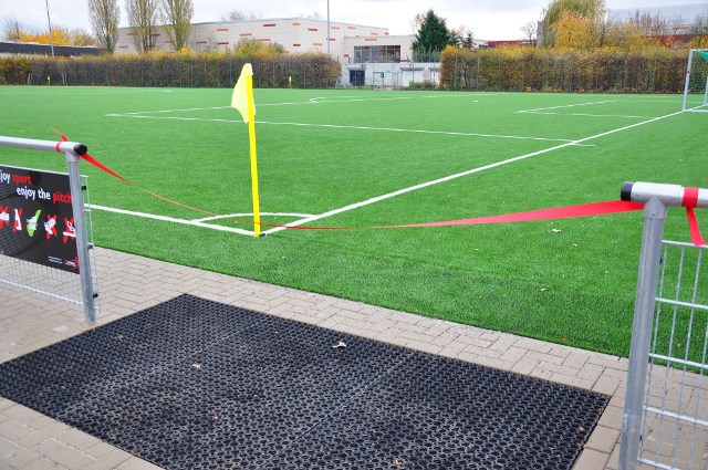 Das zuvor von einem Prüflabor auf toxische Belastung geprüfte und für unbedenklich eingestufte Gummigranulat ist am 01.10.12 auf den frischen Kunstrasenbelag aufgetragen worden.